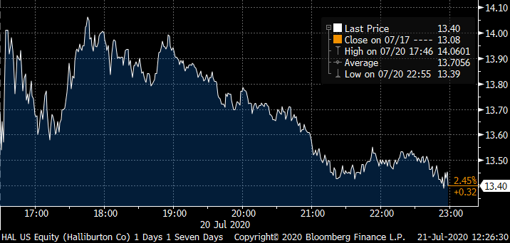 В начале недели американская нефтесервисная компания Halliburton (HAL US) опубликовала отчетность за 2кв. 2020 года, с результатами выше консенсус-прогноза по версии Bloomberg. По состоянию на закрытие торговой сессии от 20 июля акции компании показали рост – плюс 2,45%.