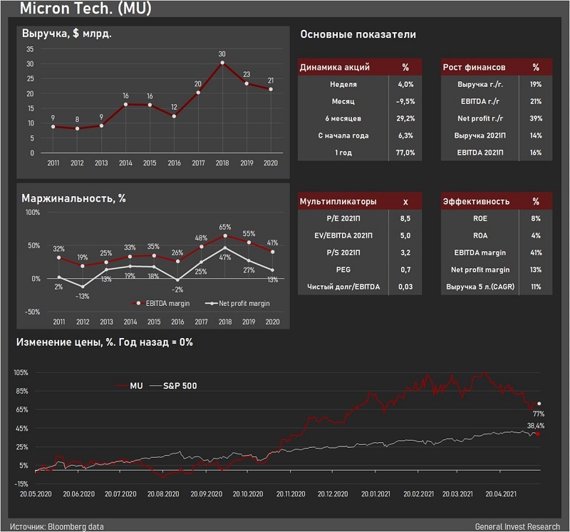 Рынок памяти достаточно цикличен и зависит от баланса спроса и предложения. Спрос и цена на память росли в 2017–2018 годах, что увеличило объем рынка производителей чипов c $79,4 млрд в 2016 до $129,9 млрд в 2017 году, и до $163,3 млрд в 2018 году. Однако из-за избытка предложения цены на память упали в 2019-2020 годах. Если раньше чипы памяти использовались преимущественно в ноутбуках и смартфонах, то с развитием технологий они находят применение в новых сегментах. Мы ожидаем начало нового цикла роста цен на чипы памяти, что увеличит выручку и прибыль компании.