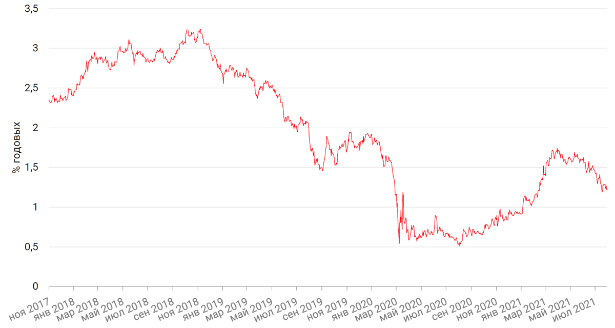 Доходность 10-летних казначейских облигаций США вновь снизилась на 5 б.п. до 1,22% годовых. Итоги заседания ФРС США не внесли большой ясности в вопрос сроков и других параметров ожидаемой инициативы по сворачиванию покупки активов. Глава ФРС США вновь повторил мантру о временности инфляции и при этом необходимости дождаться достижения целевых показателей по росту рынка труда прежде чем предпринимать какие-либо меры, направленные на охлаждение экономической активности.
