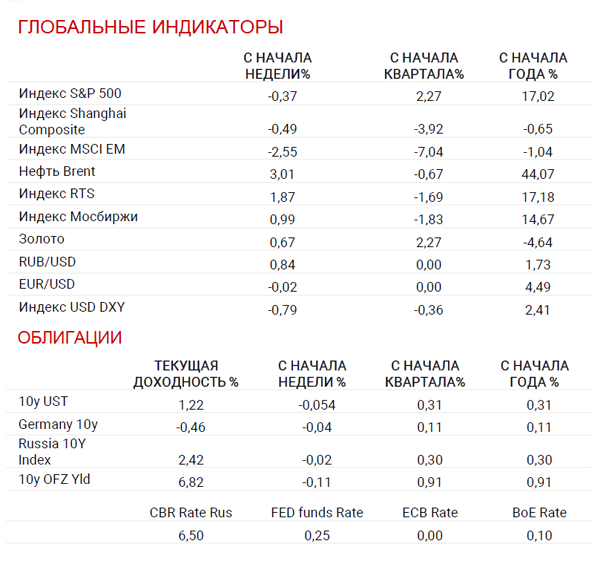 Российские фондовые индексы на минувшей неделе показали умеренный рост, выступив лучше широкого индекса развивающихся рынков, остававшегося под давлением распродаж в китайских акциях и новой волны коронавируса, которая сильнее отражается на развивающихся экономиках из-за более низкой доступности вакцин и качества медицины в целом.