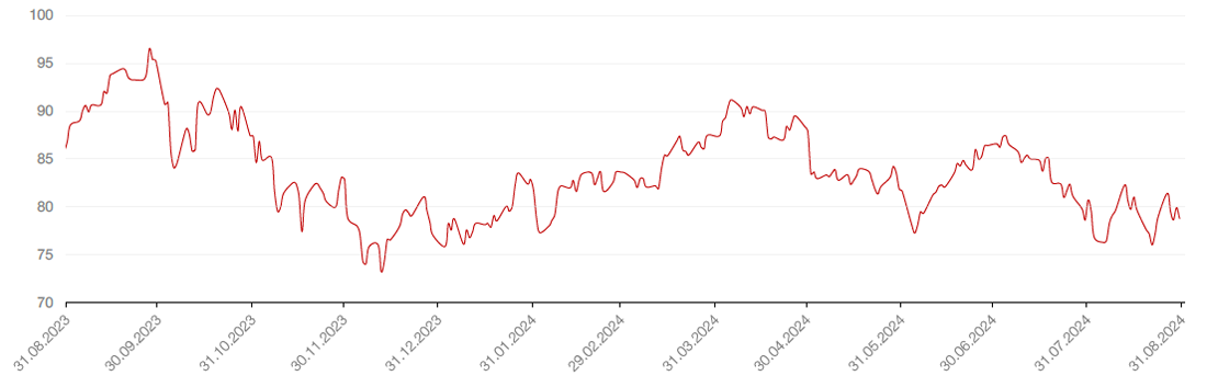 Цены на нефть продолжали потихоньку сползать вниз. По итогам недели ближайшие контракты на Brent снизились на 0,3% с 79,02 до 78,8 доллара за баррель. За август цены просели на 2,4%. Главными факторами, оказывающими давление на цены на нефть, являются сохраняющаяся слабость китайской экономики и планы ОПЕК+ по увеличению добычи на 180 тыс. баррелей в день.