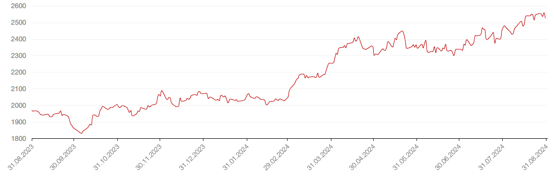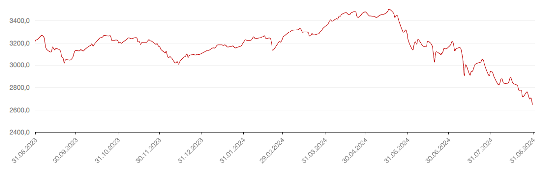 Индекс S&P 500 завершил ростом как прошедшую неделю (+0,24%), так и август (+2,28%). После «черного понедельника» 5 августа 2024 года оставшаяся часть месяца была отмечена восстановлением рынков, обусловленным данными по инфляции и розничным продажам, которые несколько успокоили опасения по поводу рецессии, а также сигналом ФРС о готовности к снижению процентных ставок.