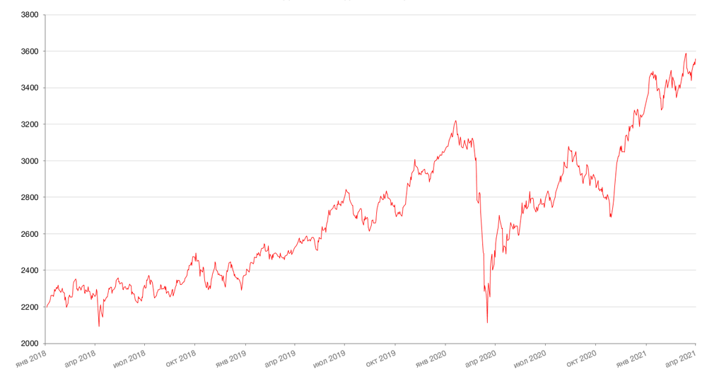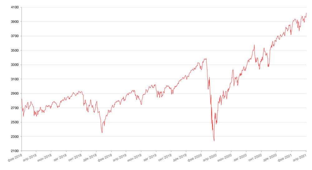 Первая неделя второго квартала 2021 года началась с достижения новых исторических максимумов по индексу S&P 500. Впервые в истории индекс 500 крупнейших компаний США превысил отметку в 4000 пунктов и завершил неделю на отметке 4019 пунктов, поднявшись на 2,82%. Для преодоления четвертой тысячи индексу понадобилось всего 434 торговых дня, в то время как для роста с 2000 до 3000 пунктов потребовалось 1227 торговых дней.