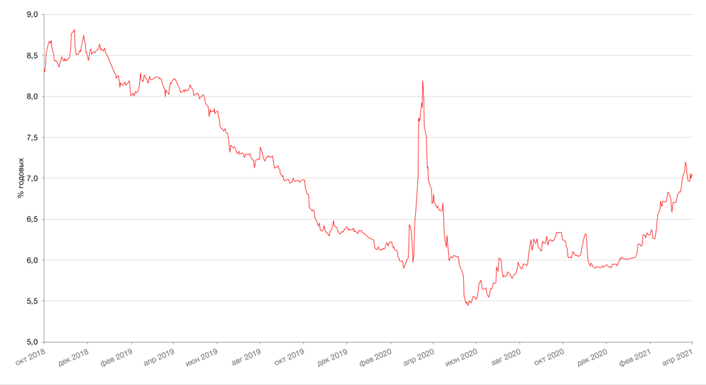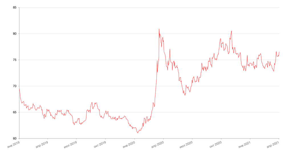Фунт по итогам недели, напротив, вырос к доллару США на 0,3%. Долгосрочные перспективы фунта оцениваются достаточно позитивно, учитывая ожидания активного восстановления экономики Великобритании благодаря успешной вакцинации. По отношению к евро фунт продемонстрировал самый сильный рост в 1 кв. 2021 г. за период с 2015 г. (+4,8%). Тот факт, что стране удалось избежать Brexit без сделки также поддержал британскую валюту.