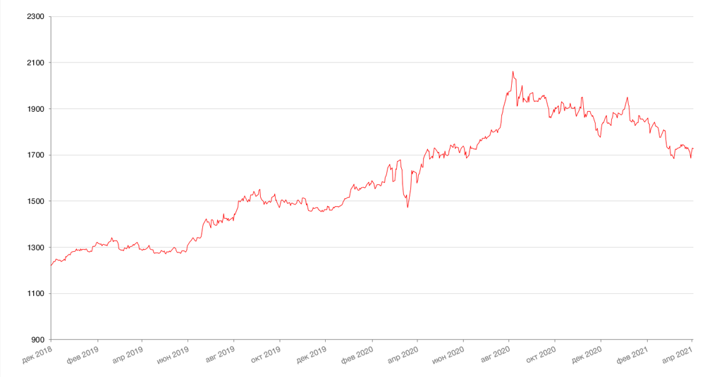 Цены на золото за неделю почти не изменились (-0,2%) и находятся около уровня сопротивления $1735 за унцию. От исторического максимума этот уровень уже ниже на 20%. Прогнозы по дальнейшей динамике цены на золото диаметрально противоположные – от снижения к уровню $1600/унц. до роста к отметке $2200/унц.