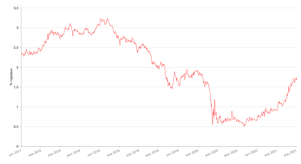 В первом квартале облигации Казначейства США показали рекордное снижение с 1980 года – доходность выросла на 81 б.п., облигационный индекс Bloomberg Barclays U.S. Treasury Index снизился на 4,25% на фоне выделения Вашингтоном нового пакета бюджетных стимулов объемом $1,9 трлн и нежеланием ФРС предпринимать какие-либо меры в отношении роста рыночных ставок.