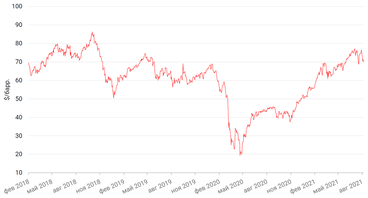Цены на нефть сорта Brent на минувшей неделе упали на 7,38%, что стало сильнейшим снижением с октября 2020 года. Причиной столь резкого движения стали с одной стороны опасения по поводу быстрого распространения нового штамма коронавируса «дельта» и влияния на спрос новых ограничений, в том числе в Китае, где власти ограничили междугородние перемещения, и в Европе, где также предпринимаются меры по сдерживанию заболеваемости. С другой стороны, котировки отреагировали на рост доллара США и вероятность более раннего сворачивания программ выкупа активов США, что может частично элиминировать инфляционную составляющую роста цен.