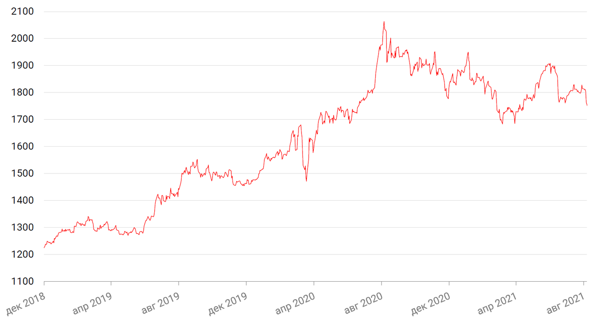 Цены на золото упали на минувшей неделе на 2,82% и закрылись на уровне $1763,03 за тройскую унцию - cамого низкого уровня за месяц. По прогнозам некоторых участников рынка, ФРС может объявить о решении сворачивания QE в сентябре и начать фактическое сокращение уже в январе следующего года.
