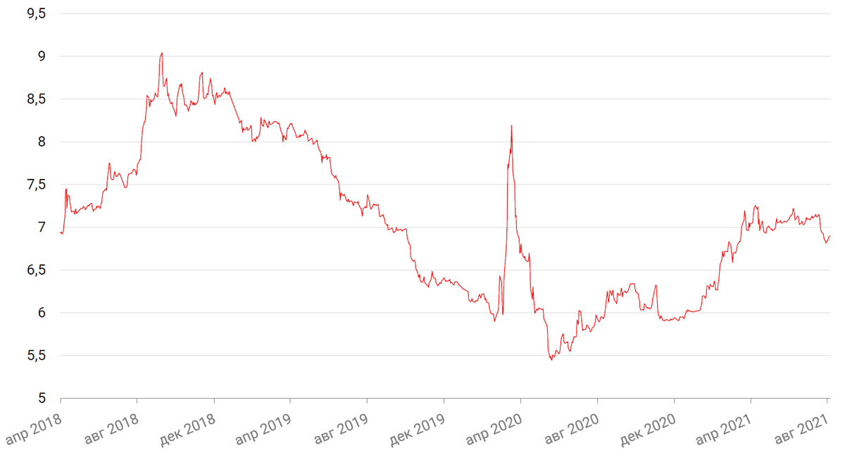 Доходность 10-летних казначейских облигаций США выросла на минувшей неделе на 7,5 б.п. до уровней февраля текущего года около 1,3% годовых после достаточно сильного отчета о занятости в США за июль, согласно которому экономика прибавила 943 тыс. рабочих мест против консенсуса на уровне 870 тыс. рабочих мест. Реальная доходность 10-летних госбумаг находится на минимальном за последние два десятка лет уровне - минус 1,2%.