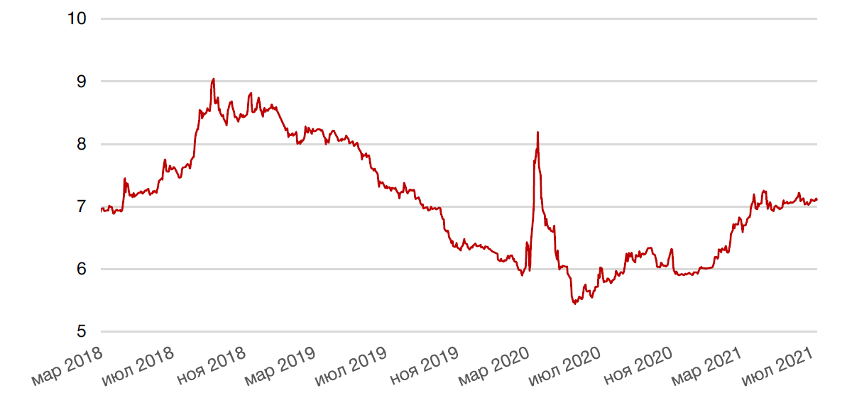 Рубль на прошлой неделе потерял почти 1,5% по отношению к доллару США. Курс доллара поднимался выше 75 руб., что могло быть связано с ростом эпидемических рисков для России, а также с покупками валюты Минфином и нерезидентами, конвертирующими дивиденды. Полагаем, что что в ближайшее время при нейтральной нефти курс доллара может пойти ниже 74 руб. на фоне ожидаемого ужесточения монетарной политики ЦБ РФ, а также продажи валютной выручки экспортерами доя обеспечения крупных дивидендных выплат, в том числе Лукойлом.