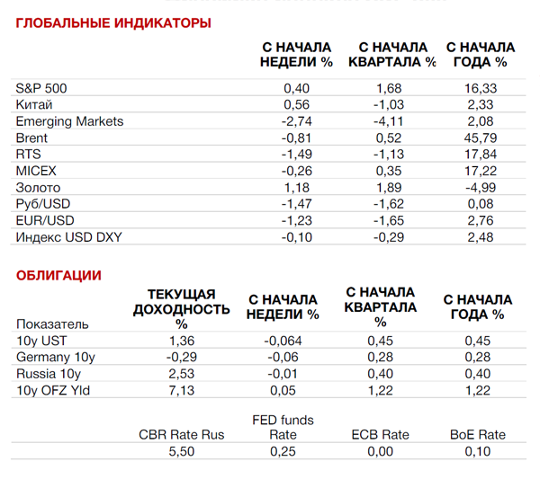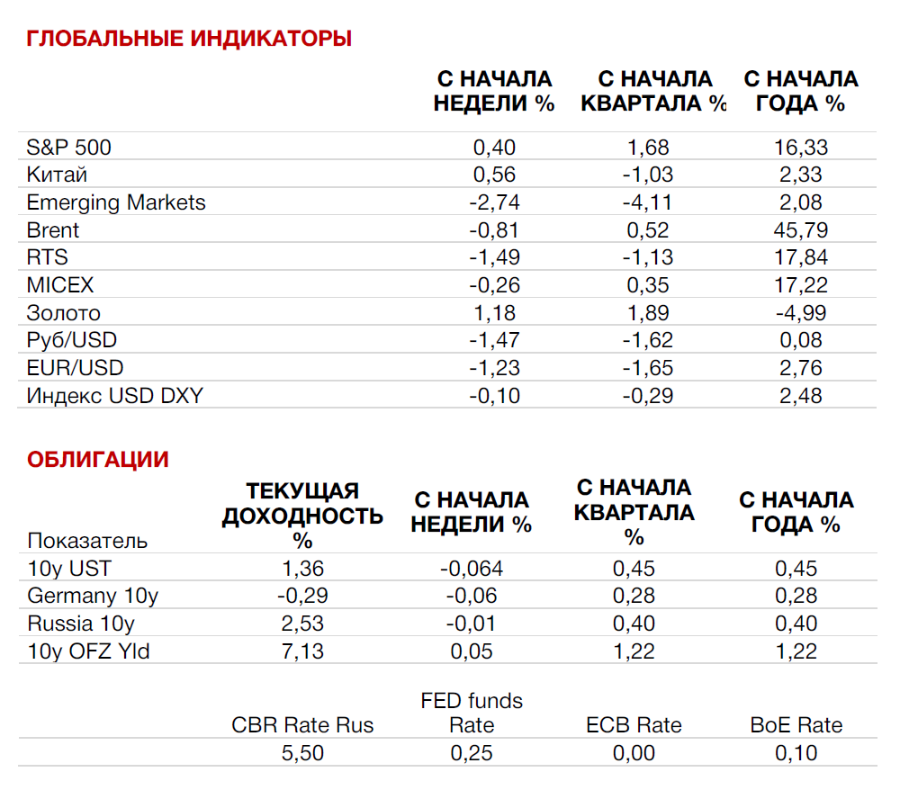 Неделя была насыщена макроэкономическими новостями. Опубликованные во вторник данные Института управления поставками (ISM) по сектору услуг США оказались слабее прогнозов, просигнализировав о возможном замедлении роста экономики. В среду был опубликован протокол июньского заседания ФРС США, в котором, как и ожидалось, содержались принципы мягкой монетарной политики, отмечался рост инфляции и говорилось о необходимости полного восстановления рынка труда прежде, чем сворачивать меры поддержки экономики. При этом, однако, некоторые участники заседания говорили о том, что момент сворачивания мер поддержки может наступить раньше, чем ожидалось, поскольку экономика восстанавливается более быстрыми темпами по сравнению с прогнозами. В то же время другие участники Комитета по операциям на открытом рынке ФРС США отмечали, что более слабые, чем ожидалось, майские данные по рынку труда США, требуют от ФРС проявить терпение в планировании следующих шагов.