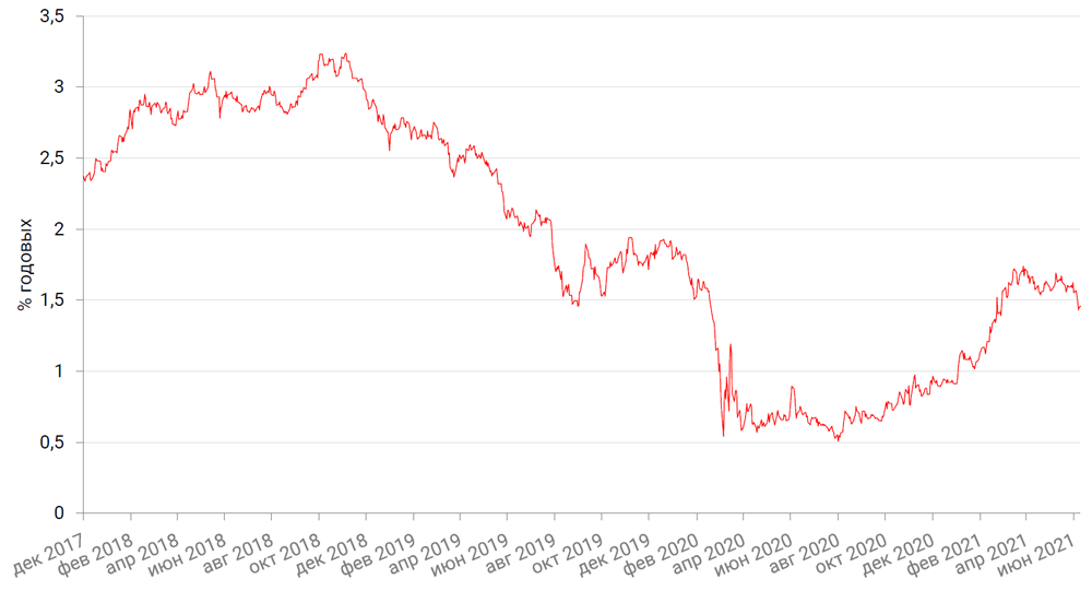 Доходность 10-летних казначейских облигаций США на прошлой неделе снизилась на целых 10 б.п. до 1,45% годовых. После данных по инфляции доходность кратковременно устремилась вверх, однако отчет о недельных обращениях за пособиями по безработице вернул инвесторов к неоднозначной картине рынка труда США, что спровоцировало снижение доходности бенчмарка к трехмесячному минимуму.