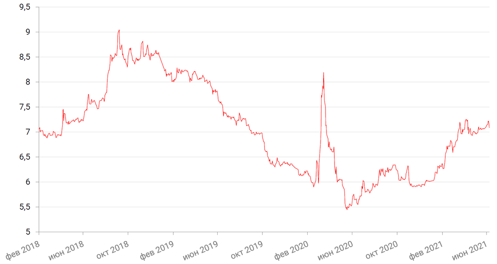 Рубль за неделю укрепился к доллару еще почти на 1,0%. Рубль рос на сильном нефтяном рынке и снижении геополитических рисков в преддверии встречи лидеров России и США (16 июня). Однако в пятницу рост рубля сначала усилился после ожидаемого повышения ставки ЦБ РФ на 50 б.п., а затем приостановился в рамках коррекционного движения на фоне укрепления доллара США перед удлиненными выходными в РФ: курс доллара вырос с 71,7 руб. до 72,08 руб. В понедельник российская валюта торговалась примерно на этом же уровне. В центре внимания – встреча президентов США и России 16 июня, а также итоги заседания ФРС США. Нам представляется, что для текущей ценовой и геополитической конъюнктуры рубль немного переоценен, и после саммита мы можем увидеть некоторую коррекцию в паре рубль-доллар США, хотя если итоги саммита будут позитивными, то не исключено и дальнейшее укрепление российской валюты.