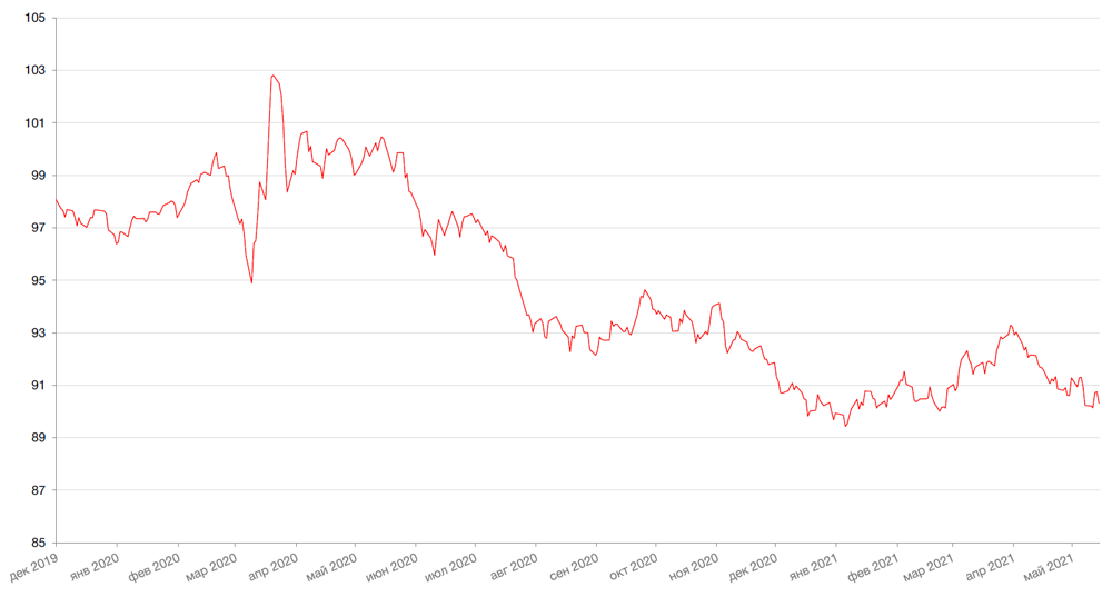 На фоне открытия британской экономики после четырех недель очередного локдауна фунт стерлингов за прошлую неделю прибавил к доллару 0,9% и в начале текущей недели торгуется около $1,4080, несмотря на заявления премьера Великобритании Бориса Джонсона о том, что индийский штамм коронавируса может помешать ослаблению ограничений в Великобритании. С начала месяца фунт подорожал более чем на 2%.