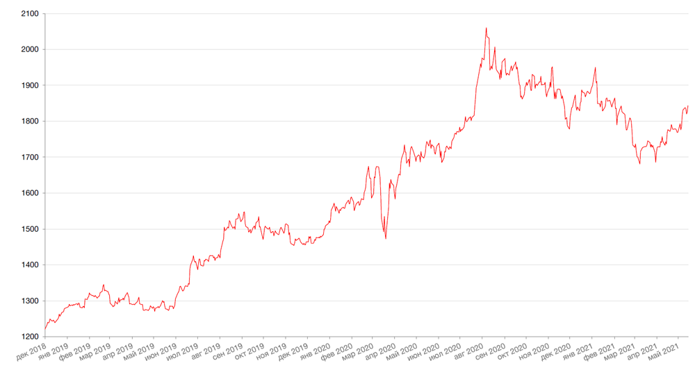 Цены на золото на прошлой неделе выросли на 0,67% и закрыли неделю на отметке $1843,43 за тройскую унцию. Рост цен на золото был обусловлен обострением опасений в отношении роста мировой инфляции.