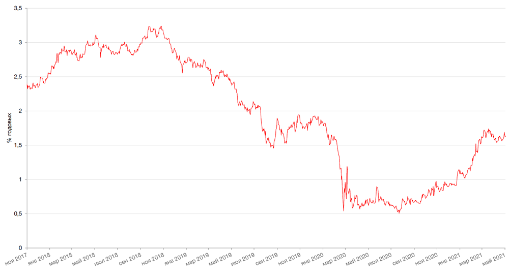 Доходность 10-летних казначейских облигаций США по итогам прошлой недели подросла на 5 б.п. до 1,63% годовых, но за период с начала мая она практически не изменилась. Апрельская инфляция в США, которая оказалась неожиданно высокой (+4,2% г/г против прогноза +3,6%), оказала слабое негативное влияние на долговой рынок. Мы видели снижение цен на длинные инструменты в пределах 1-1,5 п.п.