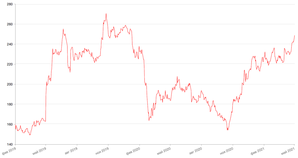 Акции Сбербанка снизились на 2,5% после дивидендной отсечки 12 мая. Полагаем, что бумаги смогут быстро закрыть дивидендный гэп. Сбербанк отчитался о рекордной чистой прибыли за апрель 2021 г. на фоне эффекта низкой базы. Рентабельность капитала составила 25,4%, рентабельность активов 3,7%. Розничный портфель увеличился на 2,4%, при этом ипотечный портфель вырос на 2,9%. Месячный объем выдачи розничных кредитов впервые превысил 0,5 трлн руб. Активы за апрель выросли на 2,0% без учета валютной переоценки и превысили 35 трлн руб. в основном за счет роста кредитов клиентам. Сохраняем позитивный взгляд на акции Сбербанка.