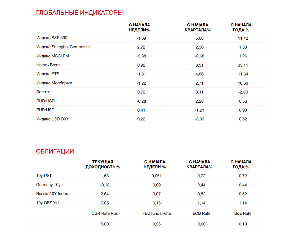 По итогам прошедшей недели большинство глобальных индексов закрылись в «красной зоне». S&P 500 закрылся с понижением на 1,39%, индекс Dow Jones Industrial Average упал на 1,1%, а Nasdaq Composite снизился на 2,3%. Негативным фактором для рынка акций на прошедшей неделе стали опасения инвесторов относительно инфляции, поскольку базовый индекс потребительских цен за апрель показал самый значительный рост с 1982 г. – +4,2% г/г. Индекс цен производителей за месяц также оказался выше ожиданий.