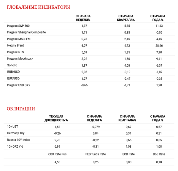 Доходность 10-летних казначейских облигаций США по итогам прошлой недели упала на 8 б.п. до 1,58% годовых, а в ходе торгов на неделе этот показатель снижался до месячного минимума 1,528%. Даже сильные макроэкономические отчеты не изменили тренда на глобальном рынке долга, который, видимо, поверил в решимость ФРС держать ставки низкими длительное время, невзирая на всплеск инфляции.