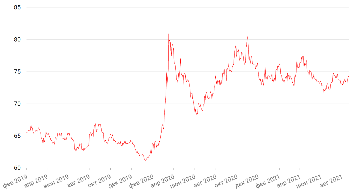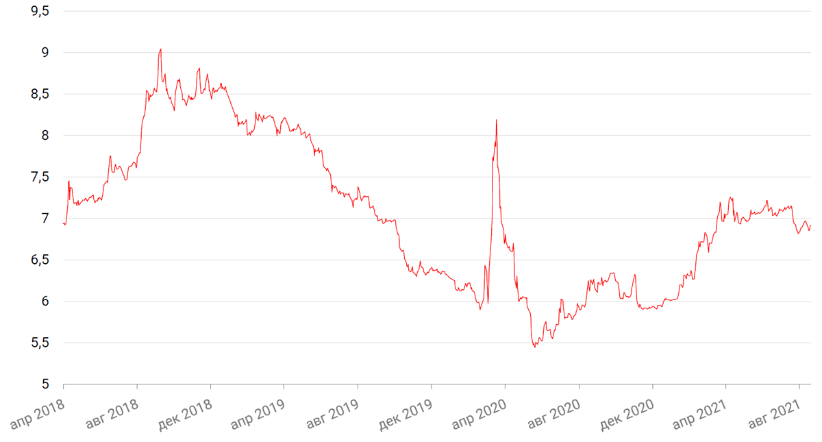 На фоне негативной реакции рынков на протокол июльского заседания ФРС США доходность американских 10-летних казначейских бумаг продолжила снижение и завершила неделю на отметке 1,26% годовых. Влияние дельта-штамма вируса Covid-19 на рост экономики и инфляцию оказывается сильнее, чем ожидал рынок, а разговоры о сворачивании программ ликвидности не утихают, что заставляет инвесторов вновь обращаться к активам-убежищам, растущим на фоне повышения неопределенности в системе. Беспокойства рынку добавили и данные о более быстром снижении в июле розничных продаж в США. В то же время глава ФРБ Далласа Роберт Каплан, который ранее настаивал на скором сокращении объема выкупаемых облигаций, в пятницу признал, что «дельта» может заставить его пересмотреть взгляды. На этой неделе рынок облигаций ожидает выступления главы ФРС США в Джексон-Хоуле, чтобы определиться со сроками начала сворачивания QE.