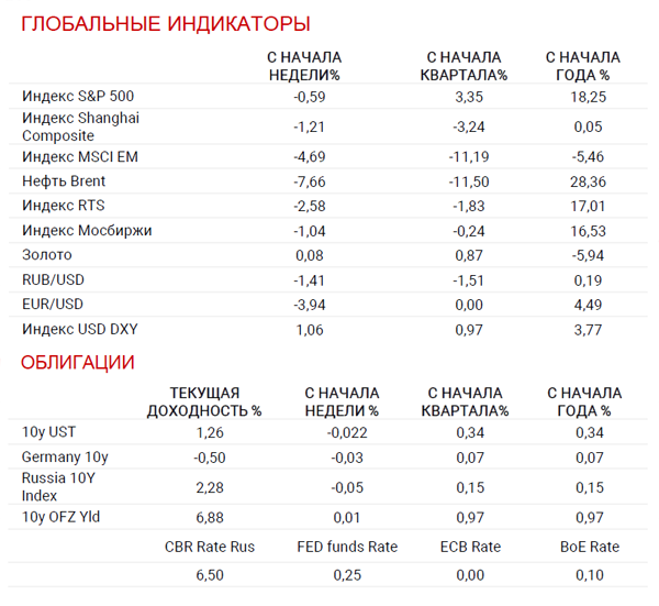 Под давлением глобальных фондовых и товарных рынков российские индексы на минувшей неделе прервали свой рост и завершили неделю в минусе. Индекс МосБиржи упал на 1%, долларовый РТС потерял 2,6% стоимости. В лидерах падения фигурировали акции Роснефти (-4,5%), а также бумаги Норникеля (-3,9%). В конце недели коррекция распространилась и на локомотивы роста рынка: бумаги Сбербанка (-0,7%) и Газпрома (-0,2%).