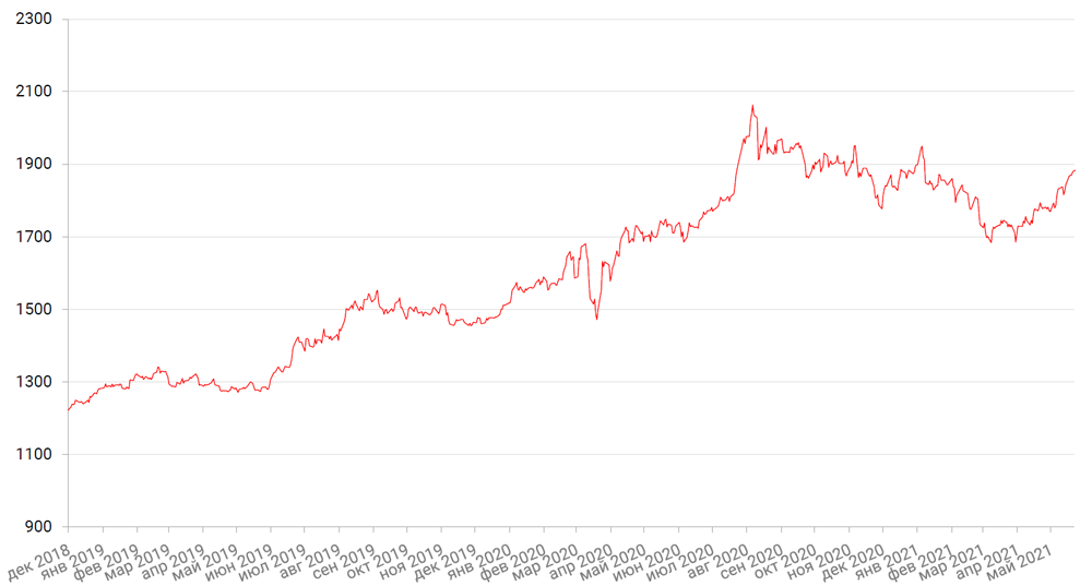 В свою очередь, цены на золото на прошедшей неделе выросли еще на 2,1% и закрыли неделю на отметке $1881,25 за тройскую унцию, чему способствуют опасения роста мировой инфляции и обвал на рынке криптовалют.