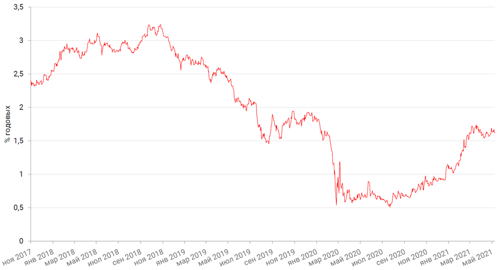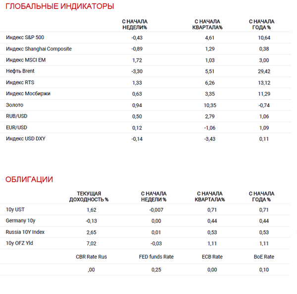 Доходность 10-летних казначейских облигаций США по итогам прошлой недели практически не изменилась, оставшись около уровня 1,62% годовых. Статистика по макроэкономике выходила неоднозначная, а в последнем протоколе заседания Комитета ФРС США по открытым рынкам большинство представителей комитета высказались за нормализацию ставок и баланса ФРС США при достижении экономикой целевых показателей регулятора, до которых, правда, пока далеко.