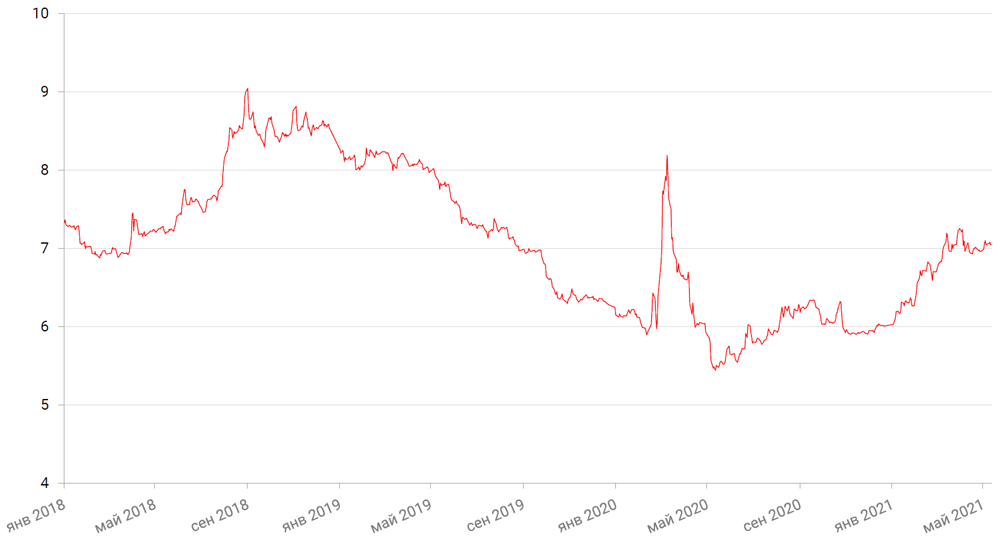 10-летние ОФЗ продолжают торговаться в коридоре 7,00 – 7,20% годовых. С начала этого года Минфин РФ разместил ОФЗ на 1,3 трлн руб. Рынок уже учел в ценах высокую инфляцию и повышение ставок до 5,75%-6% в этом году.