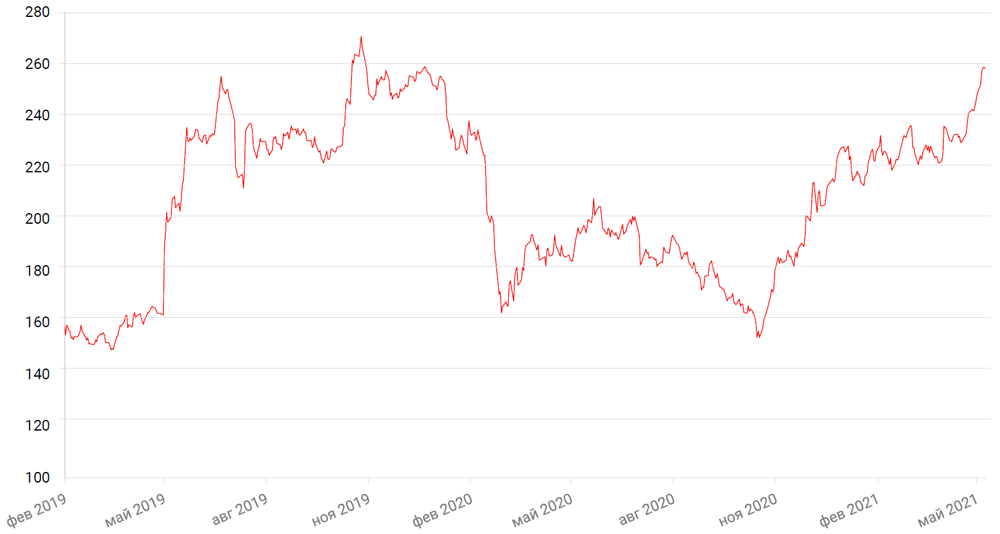 Акции МТС выросли за неделю на 2,9% на сильных результатах за 1 кв. 2021 г. Выручка МТС повысилась на 5,5% и составила 123,9 млрд руб. Скорректированная OIBDA повысилась на 6,7% г/г до 55,4 млрд руб. при рентабельности 44,7% (в 1 кв. 2020 г. 44,2%). Капрасходы увеличились до 29,3 млрд руб., что стало причиной снижения свободного денежного потока до 11,3 млрд руб.