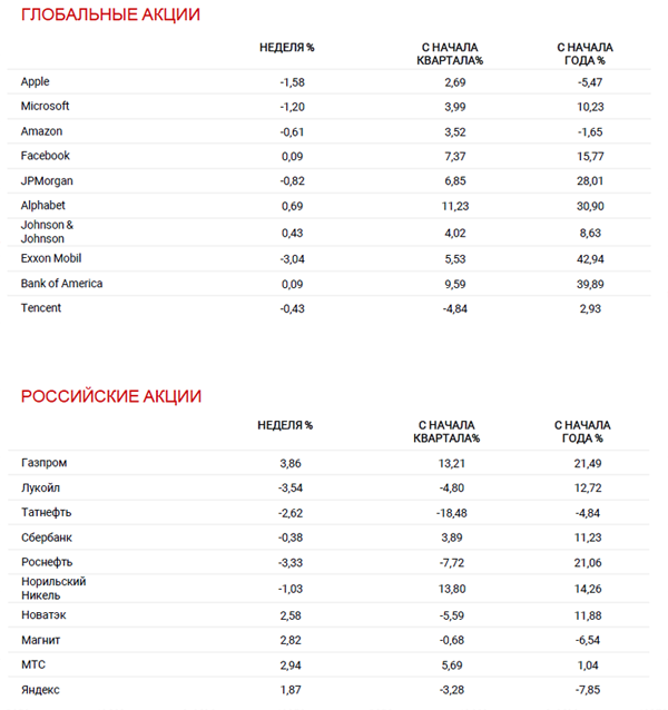 По итогам прошедшей недели большинство глобальных индексов закрылись с небольшими потерями, поскольку инвесторы продолжали концентрироваться на инфляции, а также на возвращении опасений в отношении возможного сокращения программ ликвидности ФРС США после публикации протокола последнего заседания регулятора. Американский индекс S&P 500 упал на 0,4% продемонстрировав падение вторую неделю подряд, впервые с февраля месяца, а индекс Dow Jones Industrial Average снизился на 0,5% показав четвертую неделю снижения подряд. Одним из исключений стал индекс Nasdaq Composite, который вырос на 0,3%, прервав четырехнедельную полосу неудач.