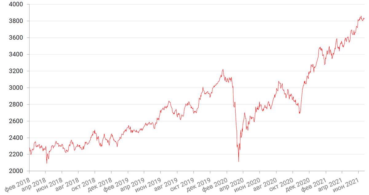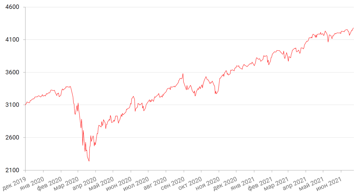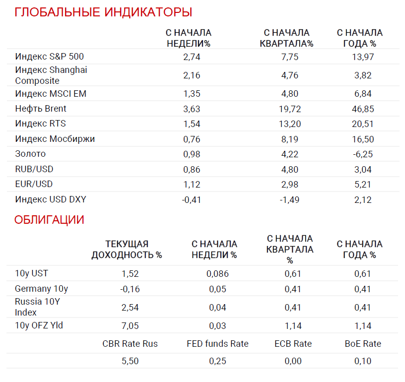 По итогам прошедшей недели большинство глобальных индексов закрылись в “зеленой зоне”. Индекс S&P 500 завершил неделю на рекордных максимумах, продемонстрировав лучшие недельные показатели с февраля, поскольку инвесторы сделали ставку на то, что более высокая инфляция будет временной на фоне выхода экономики из связанного с пандемией кризиса. Индекс S&P 500 закрылся на отметке 4280,70 пунктов, поднявшись на 2,74%, Dow Jones Industrial Average вырос на 3,4%, продемонстрировав лучшую неделю с середины марта, а Nasdaq Composite укрепился на 2,4%.