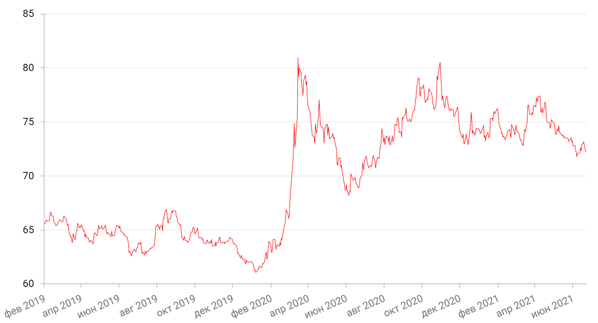 На рынке валют развивающихся стран список лидеров возглавил рубль, укрепившийся к доллару США на 0,9%. Рост российской валюты был обусловлен налоговым периодом в РФ, а также ястребиной политикой центробанка. На прошлой неделе глава регулятора Э. Набиуллина заявила, что на июльском заседании Банк России будет рассматривать вариант повышения ставки на 25-100 б.п. Опубликованные накануне ЦБ РФ данные о сохранении инфляционных ожиданий на повышенном уровне обеспечивают высокую вероятность роста ставки на ближайшем заседании. Однако неблагоприятная эпидемиологическая ситуация с распространением нового, более заразного, штамма коронавируса могут внести коррективы в изначальные планы регулятора.