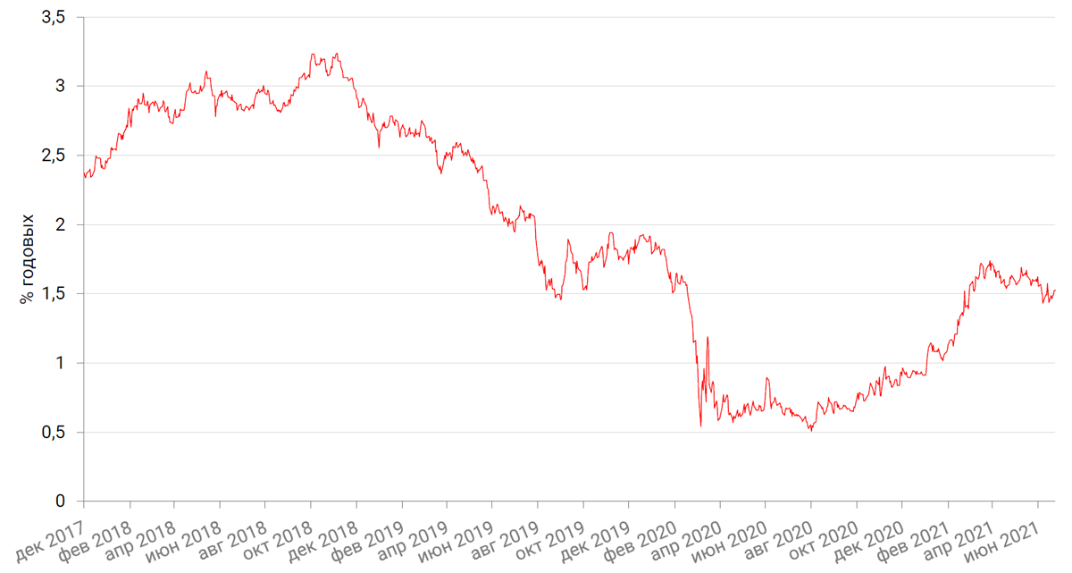 Доходность 10-летних казначейских облигаций США на прошлой неделе выросла на 9 б.п. до 1,52% годовых. На прошлой неделе представители ФРС, один за другим, пытались успокоить рынки в отношении инфляции и ужесточения монетарной политики, но в то же время нарастает и давление с другой стороны спектра мнений. Некоторые члены Комитета ФРС США по открытым рынкам допускают, что могут быть созданы условия и для более раннего повышения ставки в США. Тем не менее, глава ФРС придерживается мантры относительно временного характера инфляции, и пока инвесторы склонны верить в то, что больше благоприятствует росту рынков.