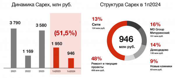 - Открытие медицинского центра в Москва-Сити 9 октября 2024 года (на 100 тыс. посещений и 1 200 циклов ЭКО в год). Общий размер инвестиций в открытие и оснащение центра составил 372 млн руб.