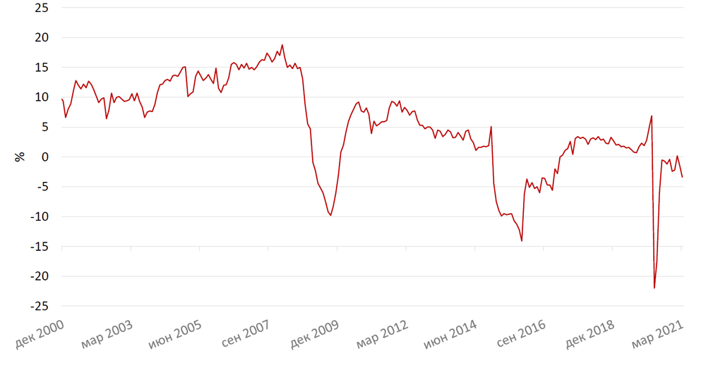 По оценке ЦБ, профицит счета текущих операций по итогам 1 кв. 2021 г. составил $16,8 млрд., что существенно больше, чем в 4 кв. 2020 г. и даже чем общая сумма профицита за последние три квартала 2020 г. Такая динамика в первую очередь объясняется фактором сезонности, тогда как за исключением этого фактора результат по-прежнему слабый. Причиной слабости выступают ограничения на добычу нефти, тормозящие экспорт, и опережающий рост импорта ввиду восстановления этой сферы после снятия карантинных ограничений.
