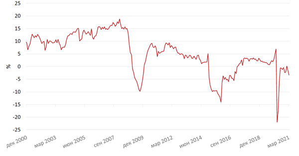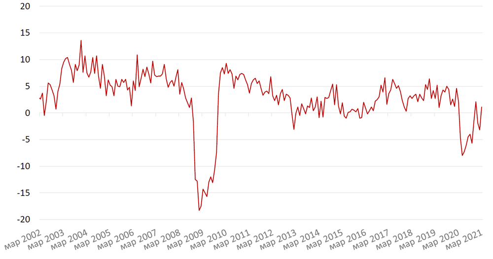 Промышленное производство, по данным Росстата, выросло в марте на 1,1% г/г, при этом февральская цифра, на которую во многом повлиял календарный фактор високосного года, была немного пересмотрена в сторону повышения с -3,7% до -3,2% г/г). Негативный вклад нефтегазового сектора в марте сохранялся, но начал постепенно снижаться по сравнению с предыдущими месяцами (-2,7 п.п. против -3,3 п.п.), что объясняется некоторым восстановлением производства и эффектом низкой базы год назад. Учитывая, что на апрель 2020 г. приходится самое серьезное снижение объёмов производства, следует ожидать, что в апреле 2021 г. может быть зафиксирован резкий рост промпроизводства, как и в целом во 2 кв. 2021 г.