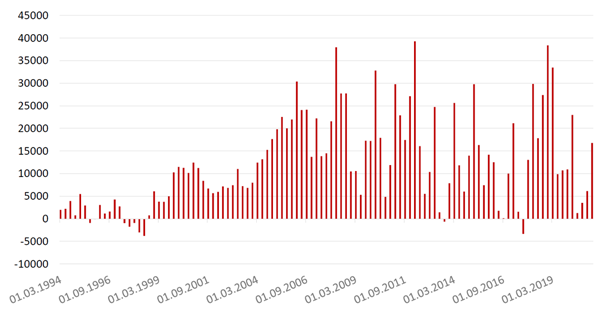 Совокупный отток капитала в 1 кв. 2021 г. составил $11,8 млрд. против $18,1 млрд. в 1 кв. 2020 г. Однако если год назад отток объяснялся во многом сокращением внешних обязательств (примерно $13,6 млрд.), то сейчас львиная доля оттока – это покупка иностранных активов ($13,5 млрд. против $4,7 млрд. в 1 кв. 2020 г). При этом снижение внешних обязательств в 1 кв. 2021 г. было в основном за счет продаж гособлигаций нерезидентами (-$3,2 млрд.), которые почти достигли уровней покупок тех же инструментов за весь 2020 г. ($3,7 млрд.).