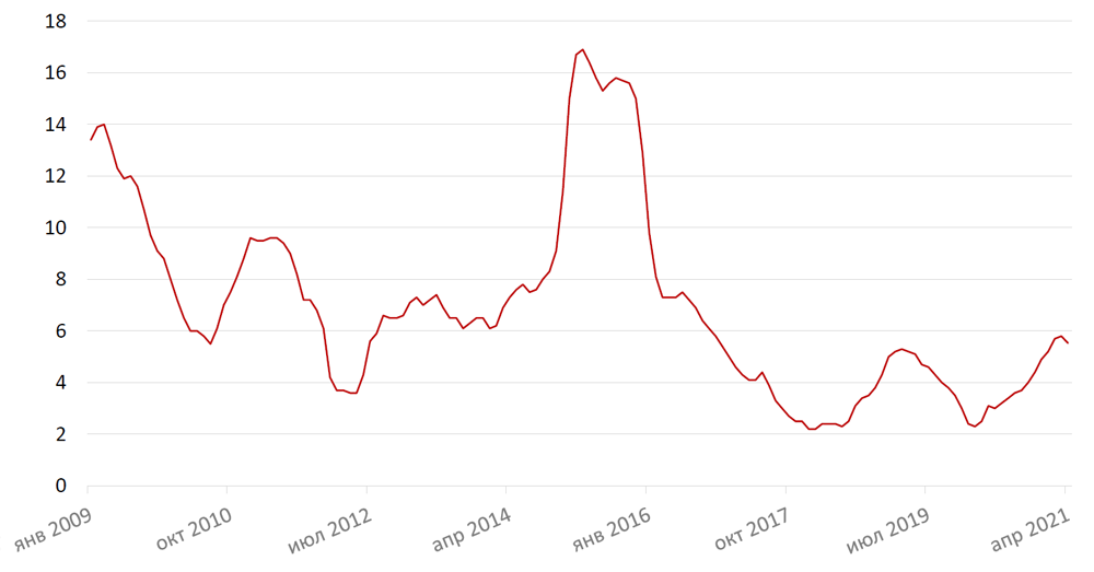 Инфляция в апреле составила 5,5%, и, хотя по сравнению с мартом темпы роста цен немного снизились, они все еще находятся существенно выше целевых показателей ЦБ. Основным дезинфляционным фактором выступили в апреле цены на плодоовощные товары, которые подорожали лишь на 4,8% против 11,9% в марте и +16,6% в феврале. А продовольственные товары, напротив, продолжают увеличивать темпы ценового роста (6,2% г/г против 5,9% г/г в марте). По оценкам регулятора, инфляция вернется к цели Банка России в середине 2022 года и будет находиться вблизи 4% в дальнейшем.
