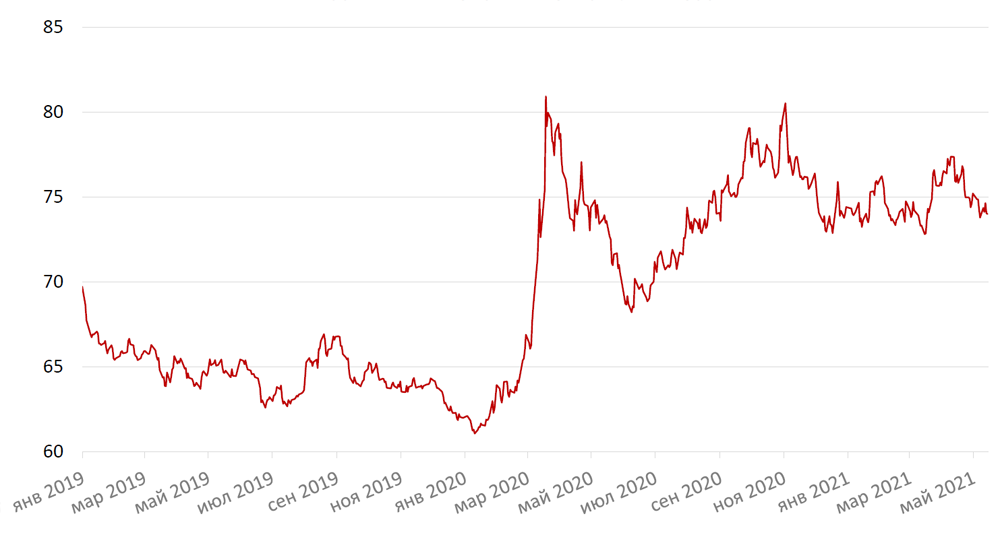 Рубль по итогам апреля укрепился на 0,6%. В течение месяца российскую валюту бросало то в жар, то в холод на геополитических новостях об усилении напряженности около восточной границы Украины, впоследствии о телефонном разговоре между президентами России и США, и о договорённости провести саммит на нейтральной территории, а затем о американских санкциях в отношении российского рублевого долга (запрет американским инвесторам покупать ОФЗ на первичных аукционах после 14 июня 2021 г.). Позже инвесторы посчитали, что санкции являются косметическими, чему в немалой степени способствовала и довольно миролюбивая риторика президента США, в результате чего рубль по итогам пяти торговых дней закрылся ростом более чем на 2%. Однако уже в выходные с американской стороны последовали заявления о возможности дальнейшего расширения санкций против госдолга и на вторичный рынок, а также о возможных «последствиях» для России в связи с ситуацией вокруг А. Навального. Поэтому рубль снова снизился. Однако закончился месяц на позитивной ноте. Главным образом инвесторов воодушевило прекращение российских учений у восточной границы с Украиной и отвод всех войск к местам дислокации с 23 апреля, что свидетельствовало о снижении уровня геополитической напряженности. Дополнительным стимулом роста рубля выступил ЦБ, повысивший ключевую ставку сразу на 50 б.п.