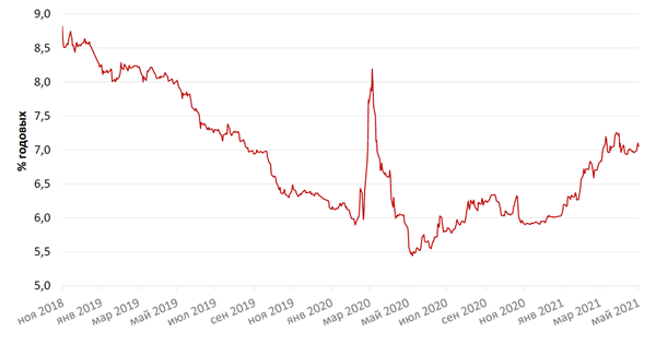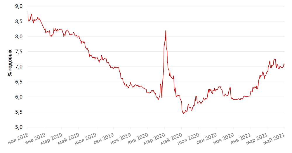 На рублевом рынке в середине апреля доходность достигала 7,34% годовых на пике геополитической напряженности и введения новых санкций в отношении российского рублевого долга, однако благодаря ослаблению внешнеполитических рисков и решению Банка России повысить ставку сразу на 50 б.п. до 5% позволило рублевым бумагам скорректироваться вверх к концу месяца. На конец года ожидания участников рынка предполагают ключевую ставку около 5,75%, в 2021 г. – около 6-6,5% на горизонте до конца следующего года. Доходность по 10-летним бумагам была на уровне 7,01% годовых.