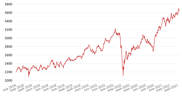 В апреле волатильность на рынках возросла. Сильные макроданные, подпитывающие надежды на быстрое восстановление американской экономики, а также ускорившиеся темпы вакцинации в США и Европе обеспечили бодрое начало апреля на глобальных рынках. Однако в середине месяца глобальные акции изменили направление движения, снизившись под влиянием сообщений о повышении налогов в США для состоятельных инвесторов в рамках нового пакета экономических мер. Тем не менее, это не помешало индексу S&P500 установить в конце апреля новый исторический максимум на фоне новых позитивных макроэкономических данных. По итогам месяца индекс S&P 500 вырос на 5,2%. Индекс развивающихся рынков MSCI EM укрепился на 2,4%.