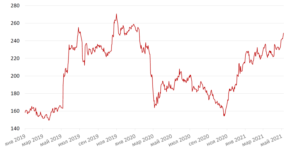 Однако некоторые бумаги продемонстрировали опережающий рост. В частности, это касалось металлургического сектора. Например, акции Северстали подскочили на 15,6% на отличных результатах за 1 кв. 2021 г. и щедрых дивидендах. Учитывая все еще сохраняющийся сильный повышательный тренд на рынке стали (цены на российскую экспортную сталь достигли рекордных уровней за более чем 12 лет. около $950/т), а также тот факт, что внутренние цены на сталь растут с 1-2-месячным лагом по отношению к экспортным, результаты следующего квартала Северстали будут не менее впечатляющими, что обеспечивает перспективу высоких дивидендных выплат и за 2 кв. 2021 г.