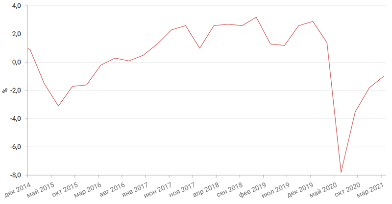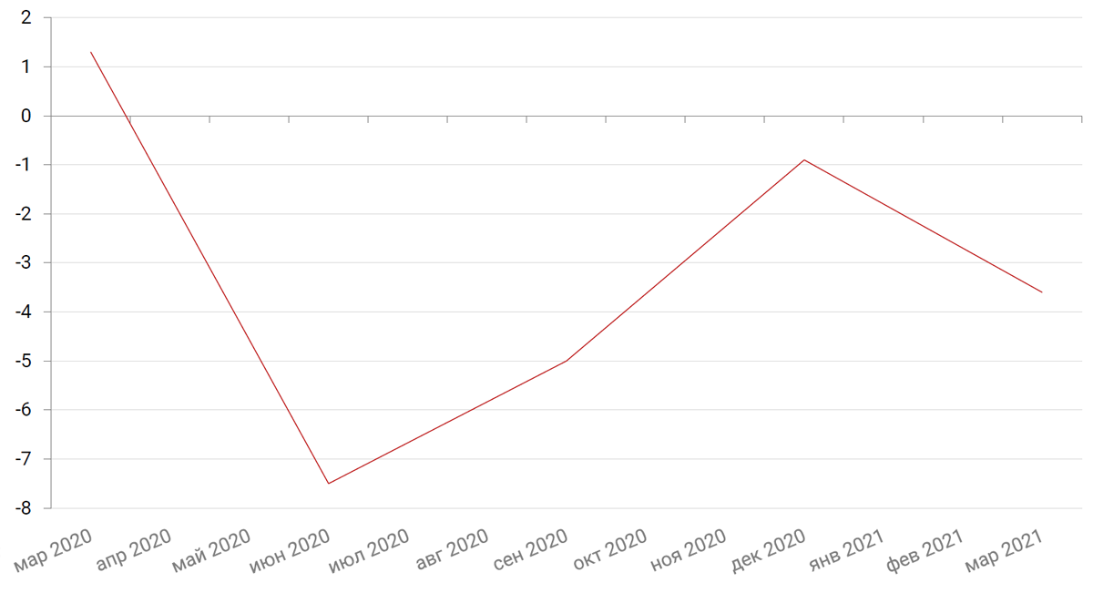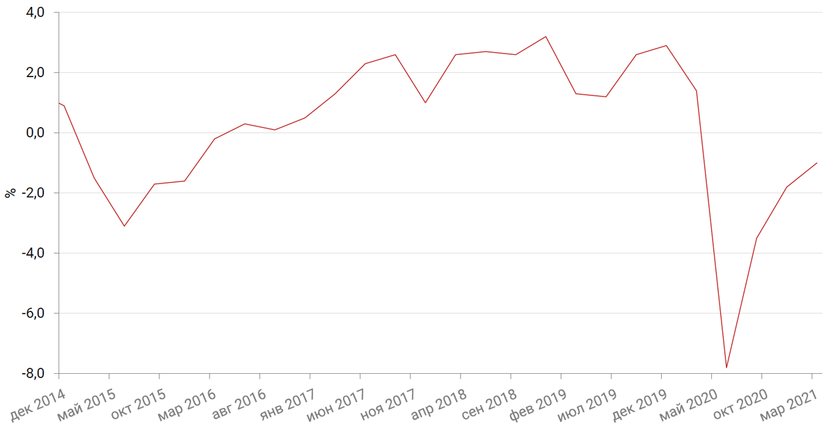 В 1 кв. 2021 г. ВВП РФ снизился, по предварительным данным Росстата, примерно на 1% в годовом сопоставлении.