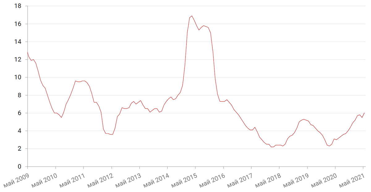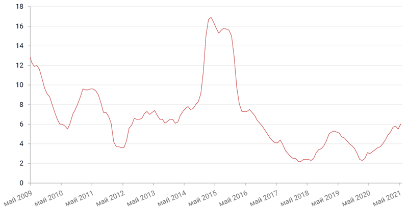 Росстат сообщил, что инфляция в РФ в мае 2021 г. ускорилась до 0,74% с 0,58% в апреле, что соответствует росту на 6,02% в годовом выражении (в апреле +5,53%). Таким образом, майский показатель превысил прогнозы аналитиков, ожидавших помесячную инфляцию на уровне 0,6%.
