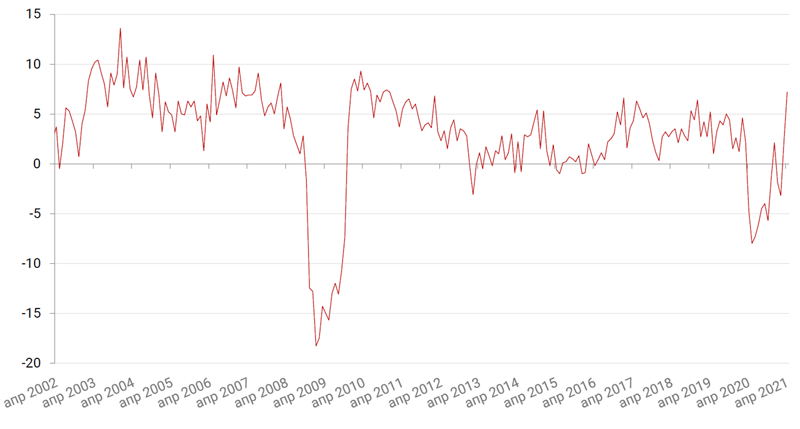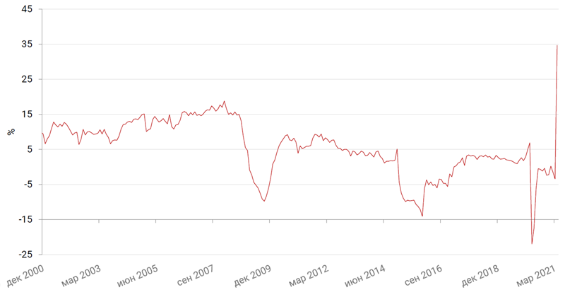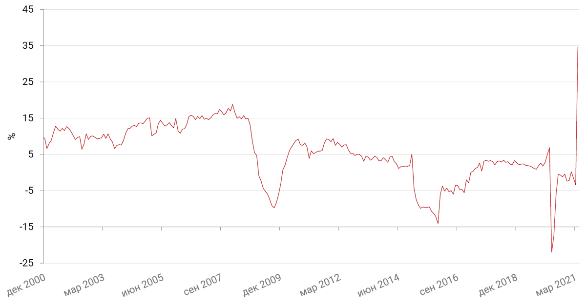 Так, в апреле потребительские расходы взлетели на 38,2% г/г, а оборот розничной торговли подскочил на 34,7% г/г. Очевидно, что такой стремительный рост является следствием эффекта низкой базы прошлого карантинного года. Напомним, что в апреле 2020 г. потребительский спрос рухнул на 26% г/г. Учитывая, что ограничения в прошлом году длились, по крайней мере, до середины июня, можно предположить, что весь второй квартал будет отмечен таким эффектом.