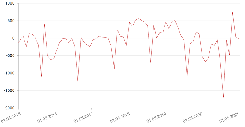 По данным Минфина, федеральный бюджет в апреле и мае 2021 г. закрылся с профицитом 42 млрд руб. и дефицитом 17,8 млрд руб. соответственно против мартовского профицита на уровне 741 млрд руб. Однако высокие доходы марта в значительной степени обусловлены поступлением в бюджет штрафа Норникеля в размере 146 млрд руб., а также остатками от сделки по Сбербанку в объёме 200 млрд руб. За их исключением динамика доходов была даже положительной. В расходной части бюджета сильнее всего выросли социальные расходы (+22% м/м в апреле с исключением сезонности).