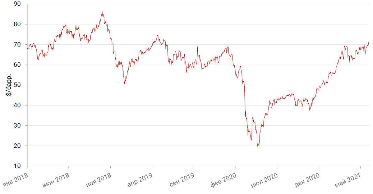 Цены на нефть сорта Brent повысились в мае еще на 3,1% до уровня выше $69/барр. на фоне восстановления спроса на глобальном рынке и невзирая на новости о возможном снятии санкций с Ирана и возращении на рынок иранской нефти в случае прогресса по ядерной сделке между Ираном и США.