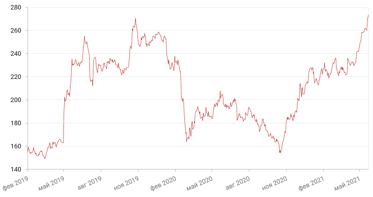 Акции МТС выросли за май на 5,7% на сильных результатах за 1 кв. 2021 г. Выручка МТС повысилась на 5,5% и составила 123,9 млрд руб. Скорректированная OIBDA повысилась на 6,7% г/г до 55,4 млрд руб. при рентабельности 44,7% (в 1 кв. 2020 г. 44,2%). Капрасходы увеличились до 29,3 млрд руб., что стало причиной снижения свободного денежного потока до 11,3 млрд руб. Сохраняем позитивный взгляд на акции.