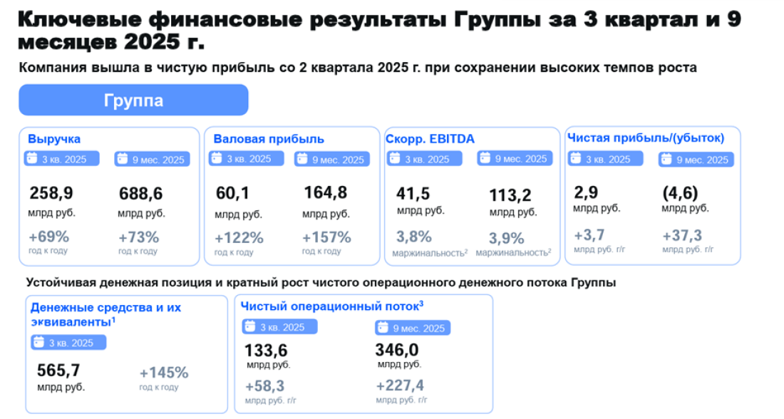 - Чистый операционный денежный поток вырос до 133,6 млрд руб. (346 млрд руб. за 9 мес. 2025 г.).