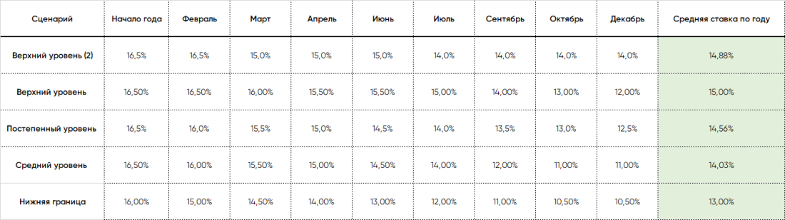 Возможные сценарии движения ставки в 2026 году в рамках текущего прогноза банка России (средняя ставка по году 13-15%)